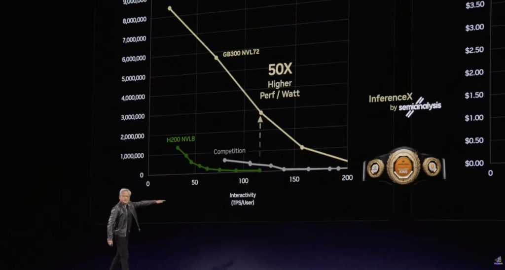 This is what every CEO in every enterprise will be looking at, he said – token efficiency in their factories, as a core operating metric. The token is a new commodity, which will be tiered in pricing once it matures: from gratis (high throughput, low speed), as we consume AI today, through intermediate, advanced, high-speed, and ultra high-speed plans (going to $150 per million tokens). Nvidia’s NVL72 is presented as the “inference king”, delivering 50-times higher performance per watt at 35-times lower cost versus its old NVL8 line, and a jump on its competitors.